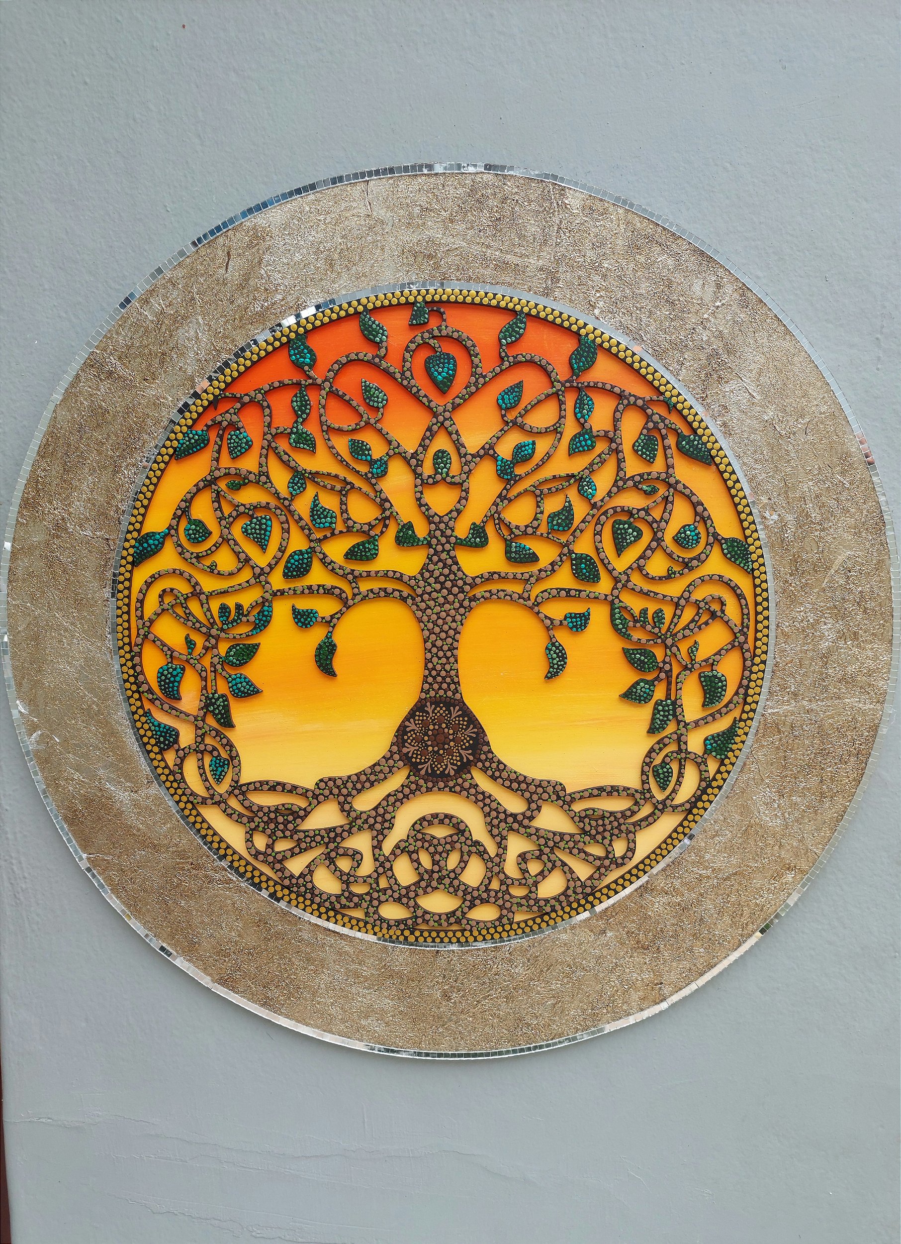 Encante-se com a Mandala Árvore da Vida, uma peça única e repleta de simbolismo. Feita em um círculo de MDF de 6mm com 55 cm de diâmetro, esta obra de arte destaca um recorte a laser da Árvore da Vida pintado com a delicada técnica de pontilhismo. A textura especial em dourado traz sofisticação, enquanto as tiras de espelho no acabamento proporcionam um brilho singular. Perfeita para decorar e energizar qualquer ambiente, essa mandala carrega a energia de crescimento, equilíbrio e conexão com o universo.