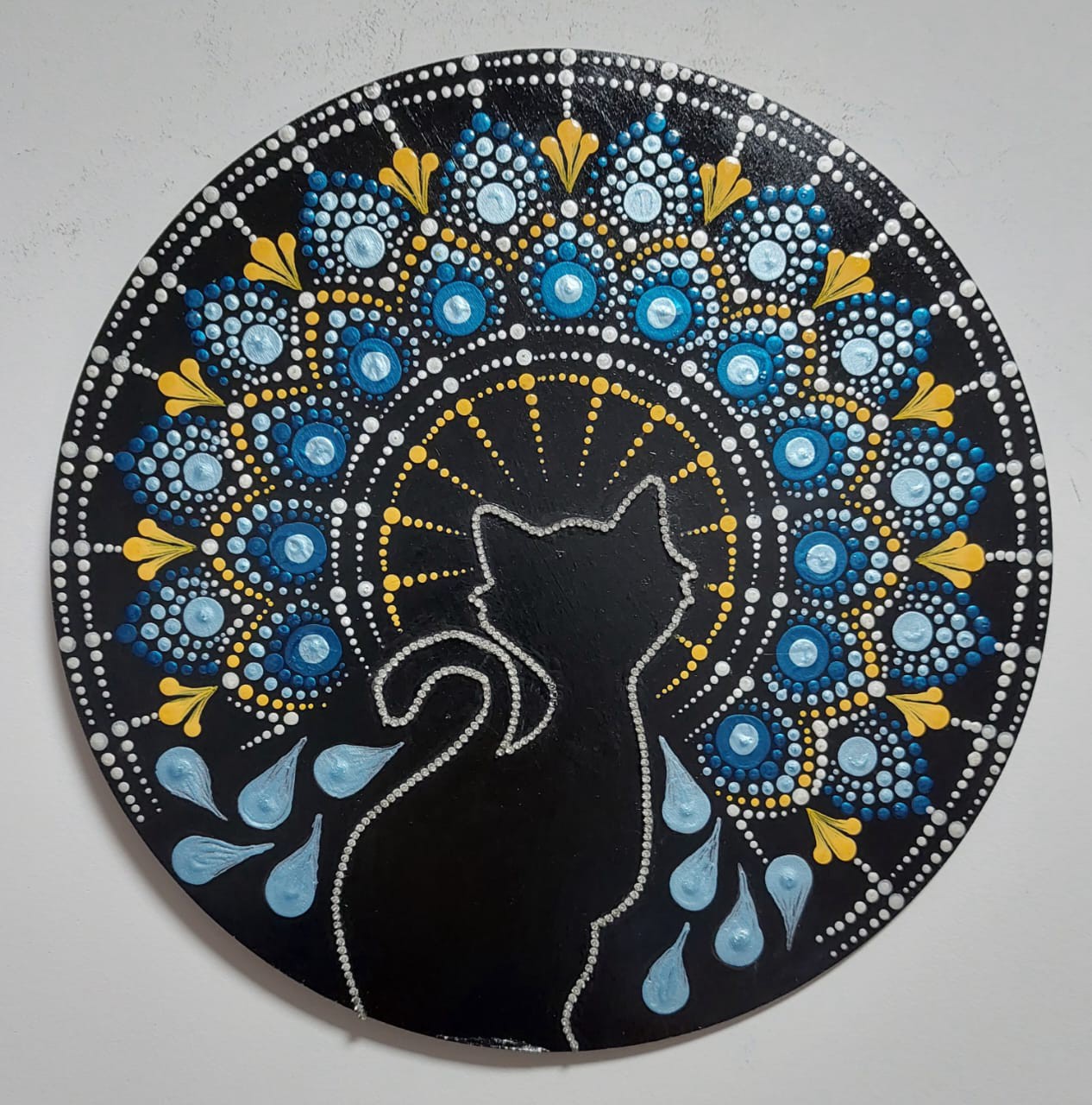 Mandala em pontilhismo, 20 cm, imagem de gatinho. Acompanha suporte para mesa.
